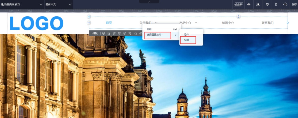 1,在头部区域,点击鼠标右键,选择层叠控件-头部。