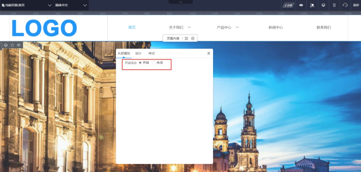 2,在头部属性里,选择开启浮动,这样网站头部区域就会固定浮动在页面的最上方了。