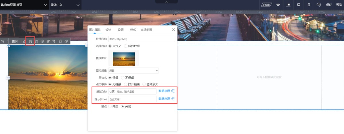 2,在图片属性里,有描述和提示的设置,这两个文本就是显示在遮罩层上的,可以自定义,也可以调用后台数据源。