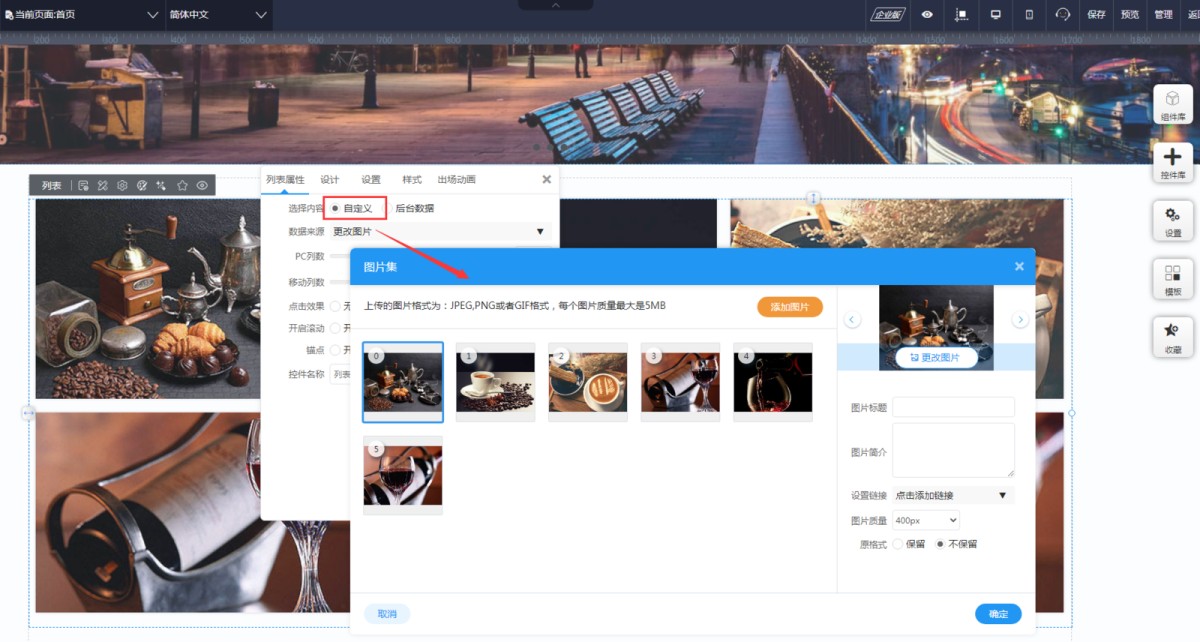 1,图片集是列表的一种样式,但是图片集又和产品新闻列表不完成一样。图片集的图片来源有2种方式,一是自定义,即在前台直接上传,如下图,这种是不能给图片集开翻页的,上传的图片只能在一页全部展示。
