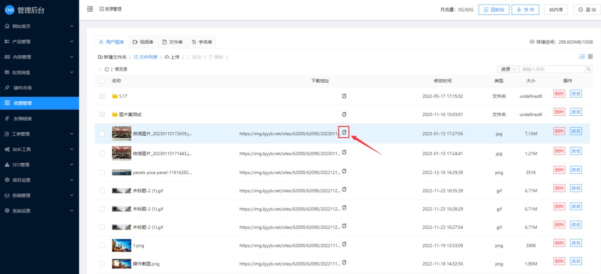 2,改成列表样式展示后,就可以看到图片或视频的链接了(视频在视频库里),点复制按钮可以一键复制图片链接。