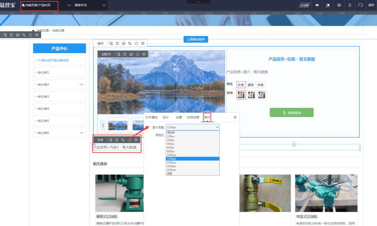 1,在导航项管理-产品内页里,找到调用后台详情的文本数据源,在控件属性里,有个“图片”,可以选择图片的质量。