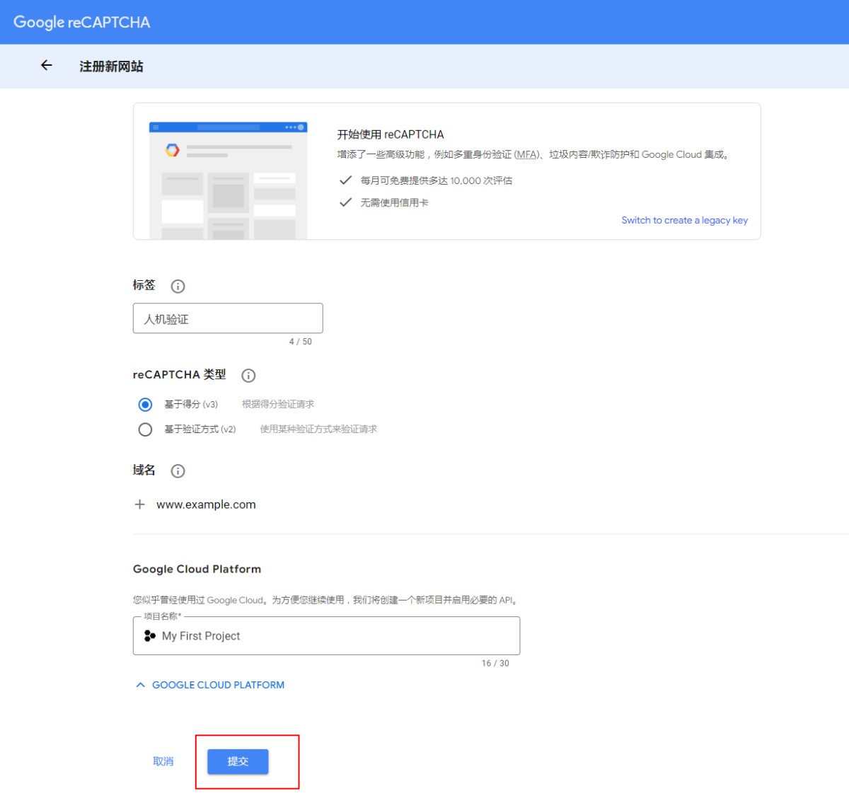 易营宝平台使用的是谷歌reCAPTCHA人机校验,所以需要登录https://www.google.com/recaptcha/admin/create申请秘钥。操作流程如下: