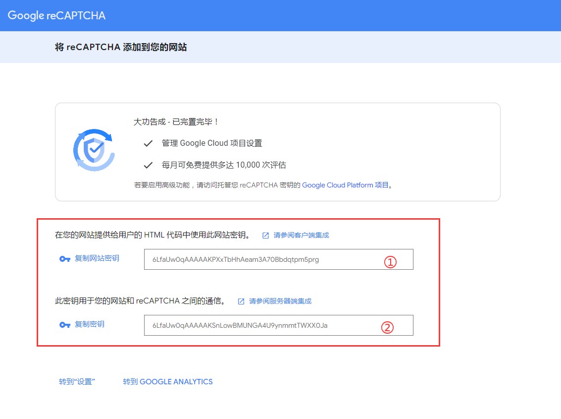 5,提交后,会得到两个秘钥,一个是网站密钥,一个是密钥。