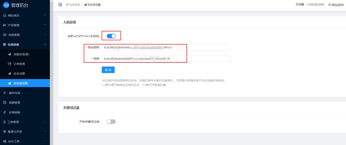 6,在网站的CMS管理后台-在线询盘-反垃圾设置里,开启人机校验,将上一步获取的网站密钥和密钥依次复制到后台。保存发布即可。