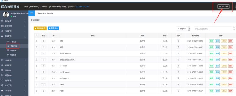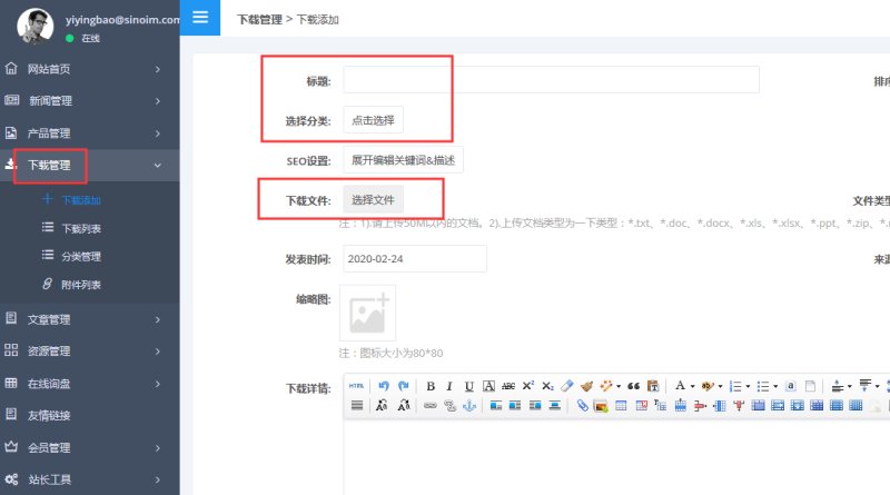 1,在“管理后台-下载管理-下载添加”里,添加文件,其中标题、分类和文件是必填项。
