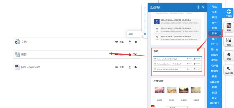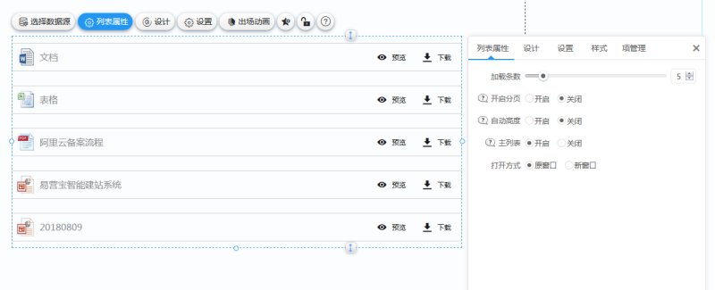 3,在编辑页面,列表控件里,下载下载列表,添加到页面上。