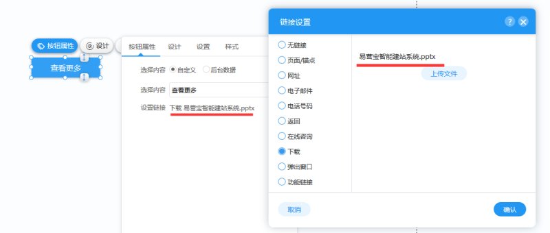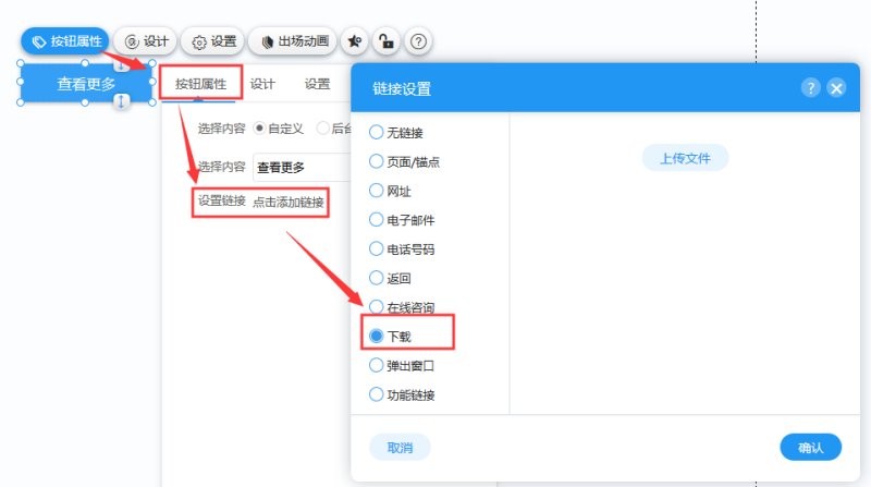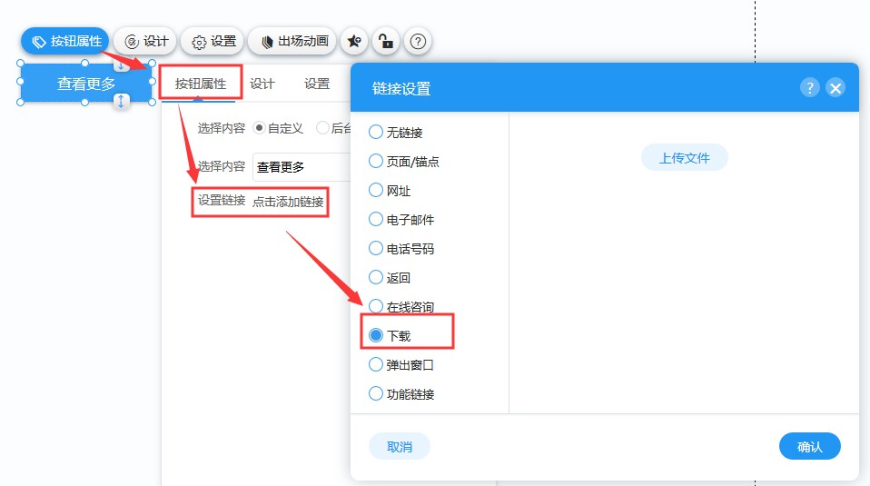 2,在“按钮属性-设置链接”里选择下载,然后上传文件。