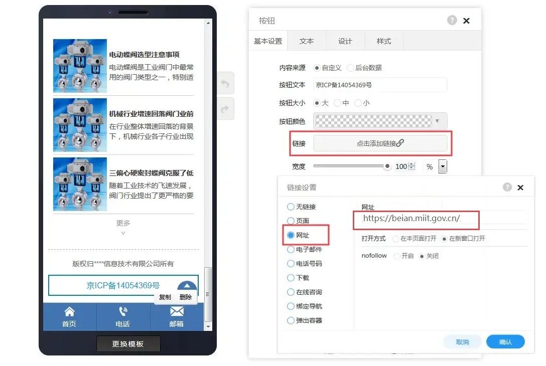 3,在按钮属性里,点击设置链接,选择网址,把工信部网址(https://beian.miit.gov.cn/)添加上,并设置在新窗口打开。