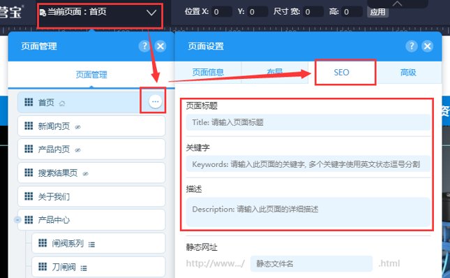 ① 在网站UI编辑页面,页面管理里,进入页面设置,在SEO里可以设置页面的标题、关键词和描述。