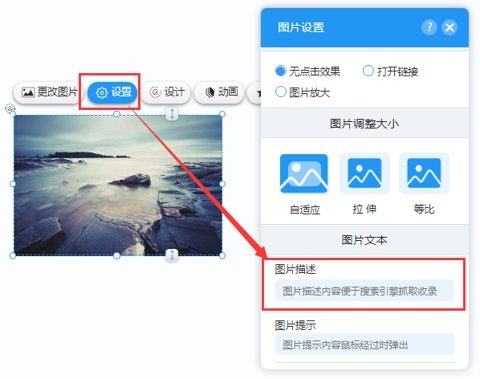 由于搜索引擎不抓取图片,所以需要给图片添加描述。图片的描述最好是与图片内容相关的词组。在图片控件属性里,可添加图片描述,图片描述建议是与图片内容相关的词组。
