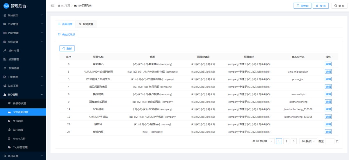 ② 也可以在CMS管理后台-SEO管理-SEO页面列表里修改。