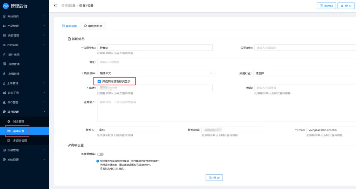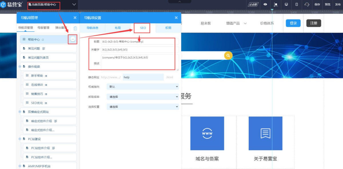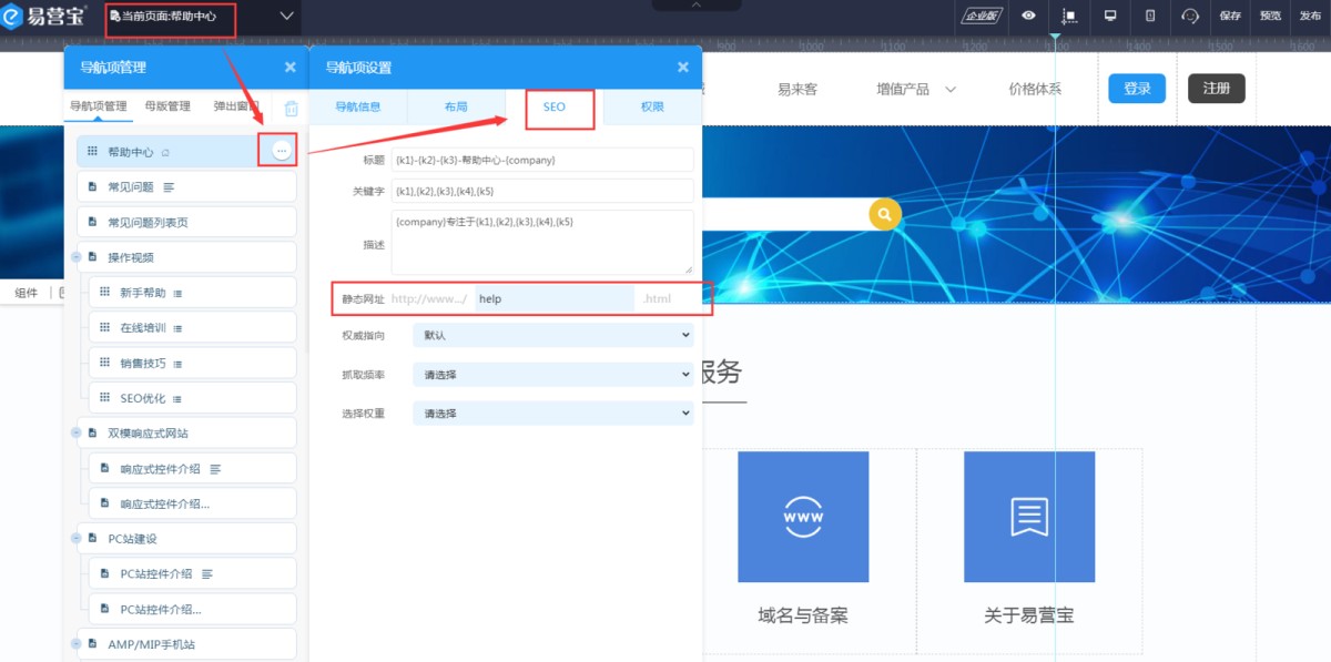 其中易营宝SAAS建站系统帮助中心公司名、+8618500331777公司电话、 李总联系人、联系人电话、yiyingbao@sinoim.com联系人邮箱、北京市西城区益民巷甲14-7号地址、易营宝建智能建站系统专注于营销型网站建设,外贸多语言网站建设,企业官网建设,网站SEO业务描述这几个变量的值是在项目设置-基本信息里修改。