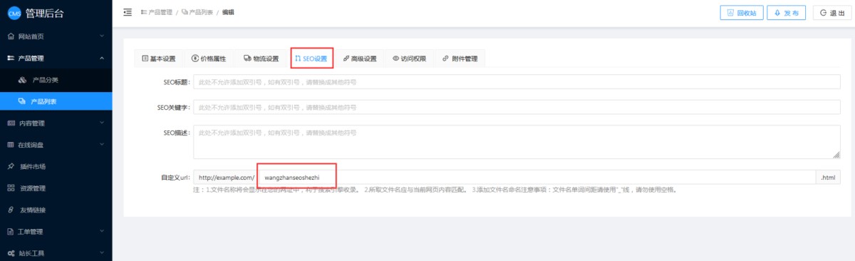 在网站页面管理里,进入页面设置,在SEO里可以设置页面的静态文件名(说明:静态文件名是唯一的,不能重复)。
