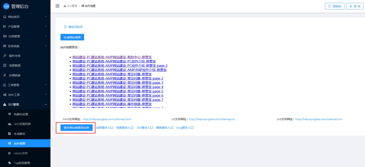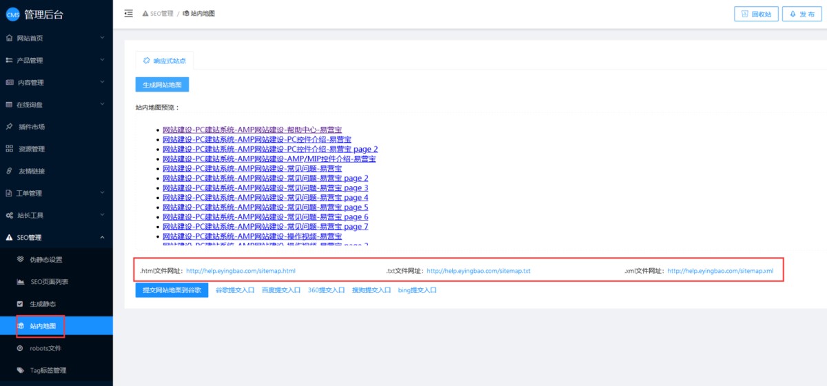 网站上线后,系统会自动生成站内地图,可在管理后台SEO管理-站内地图里查看。