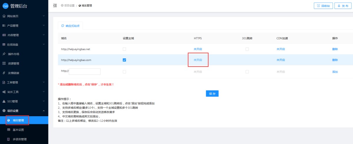在管理后台,项目设置-域名管理里,可安装SSL证书,开启https。