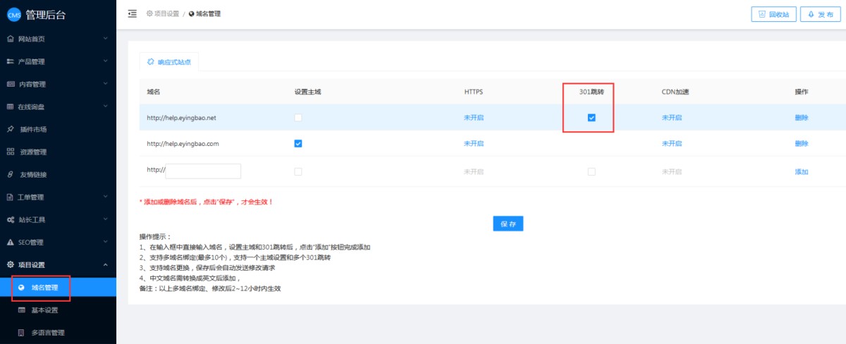 在管理后台-项目设置-域名管理里,可以设置301。
