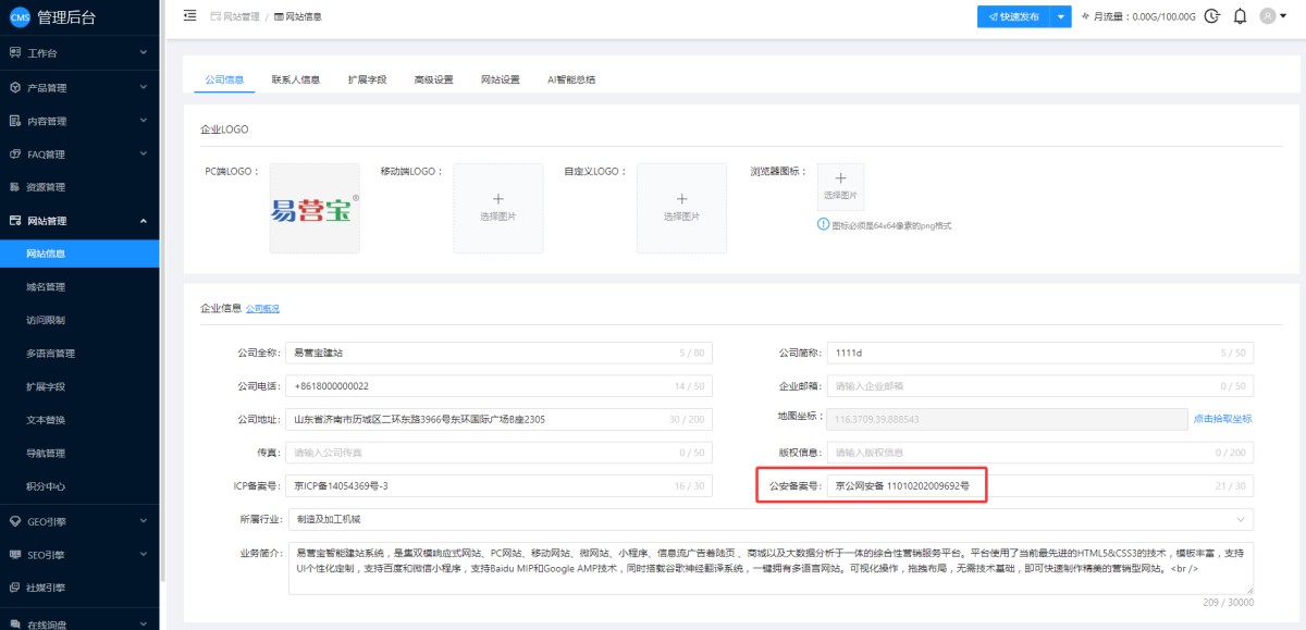 1,在CMS管理后台网站管理-网站信息-公司信息里,填写公安备案号。