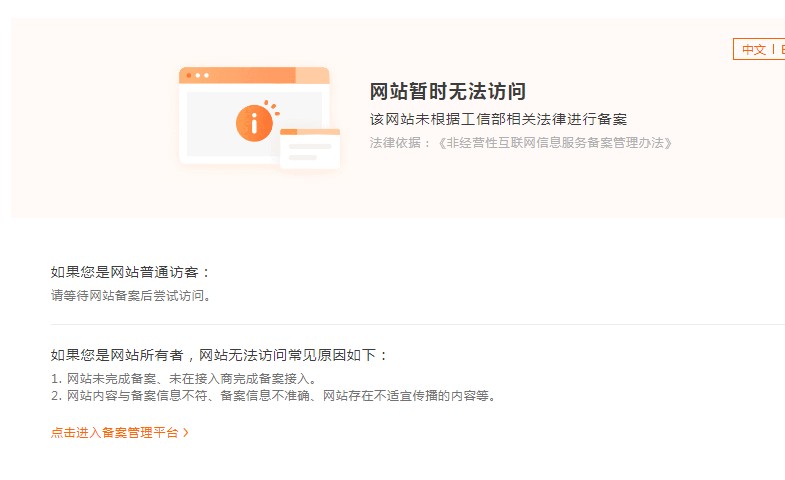 4,如果网站打开时提示如下图,说明网站上的是阿里云国内服务器,但是域名没有备案,导致网站打不开。这种情况可以申请把网站转到香港服务器,或者去阿里云提交备案。