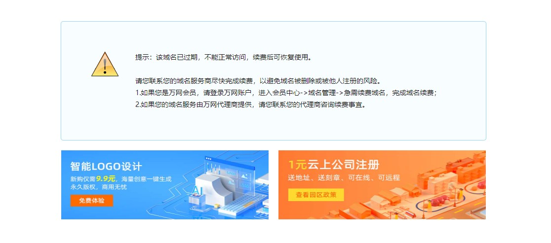 6,如果网站打开时提示如下图,说明域名已过期。联系域名服务商续费即可。续费后域名要重新解析。