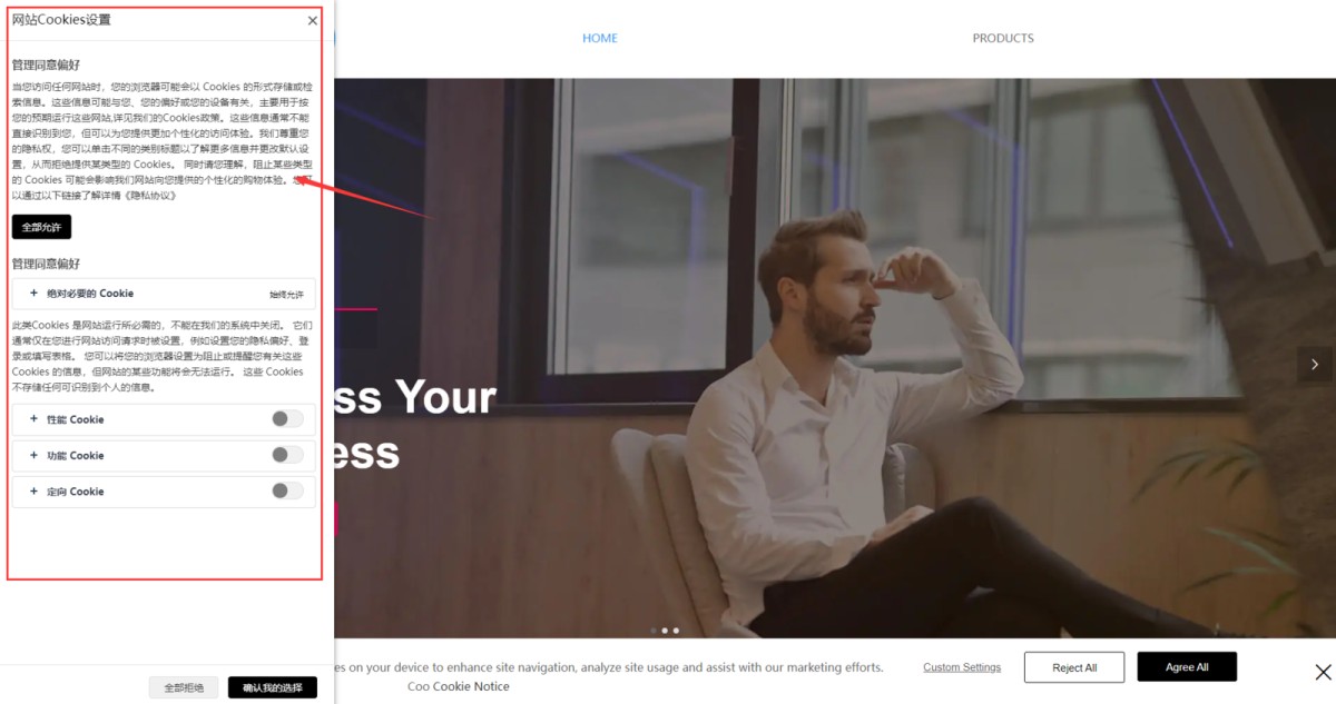 1,如下图所示,cookie设置弹窗是固定内容,他的语言是根据网站语言自动匹配的。如果cookie设置里显示的语言和网站语言不一致,说明创建网站时,网站语言没有选择正确,可以在管理后台修改。