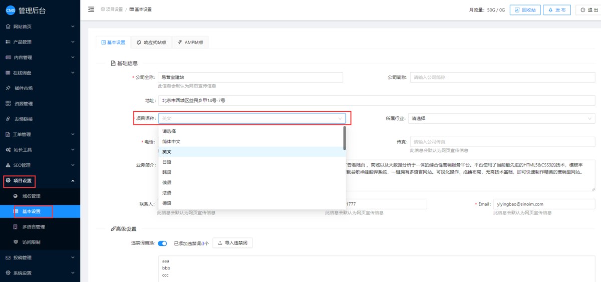 2,在CMS管理后台,项目设置-基本设置里,有个项目语种,点击下拉选择正确的语言,保存发布即可。