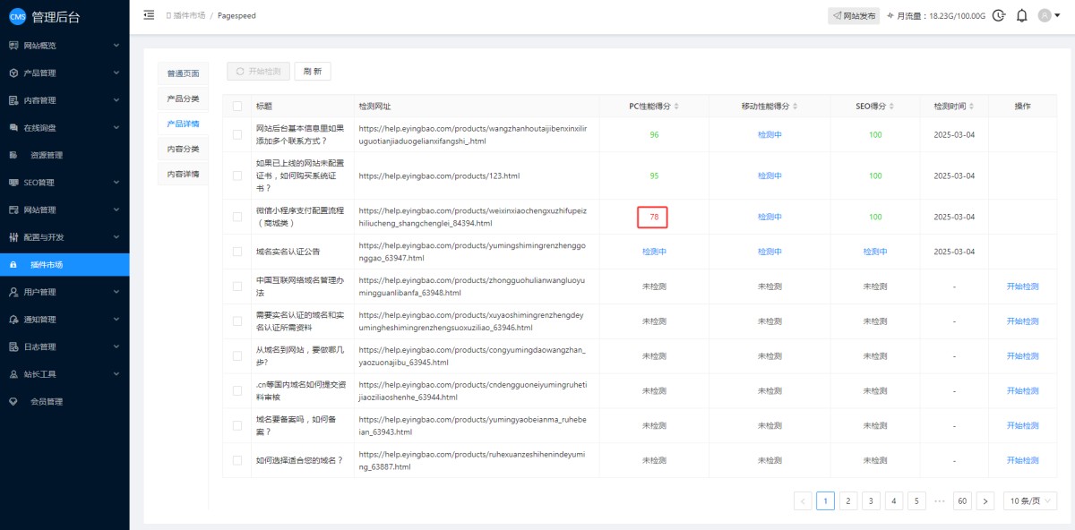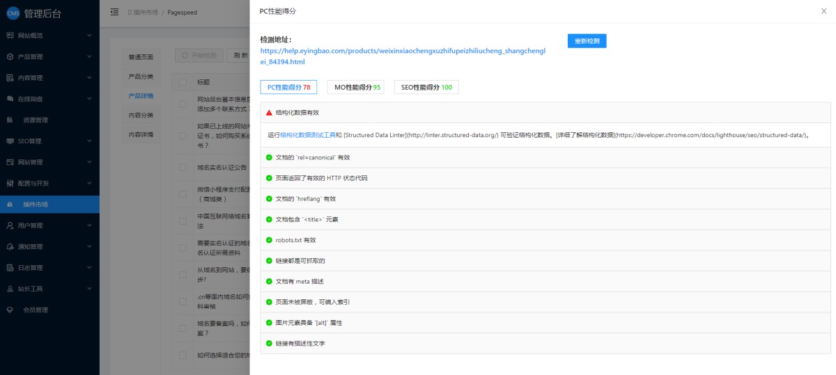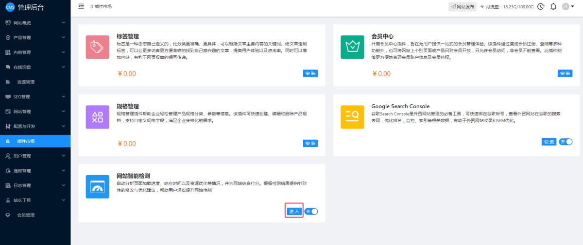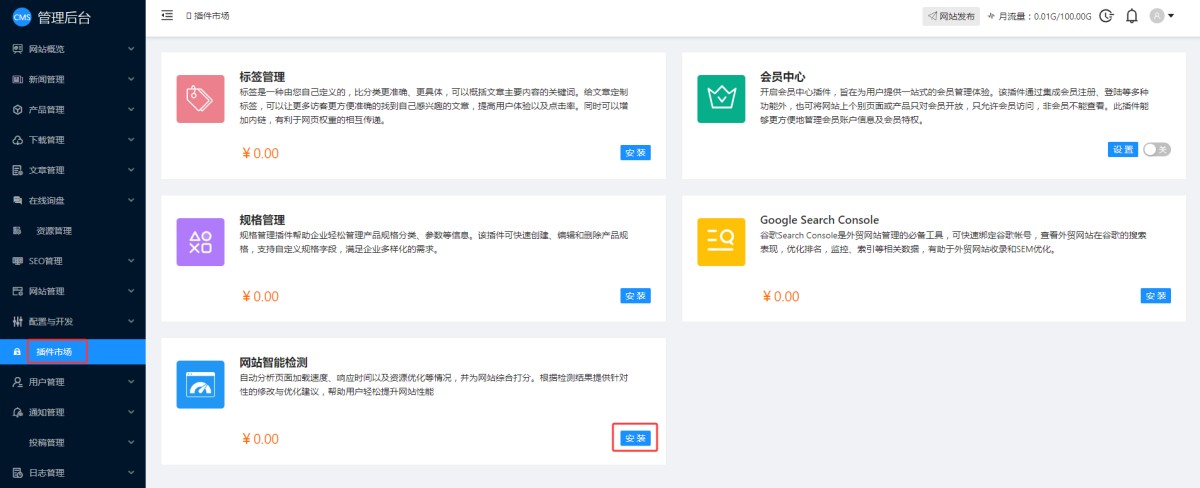 1,CMS管理后台插件市场里,找到网站智能检测,点击安装。