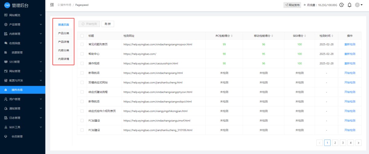 3,进入网站检测页面后,系统会自动导入网站的所有页面,用户可以在左侧选择页面类型,右侧会限制该类型下的所有页面。