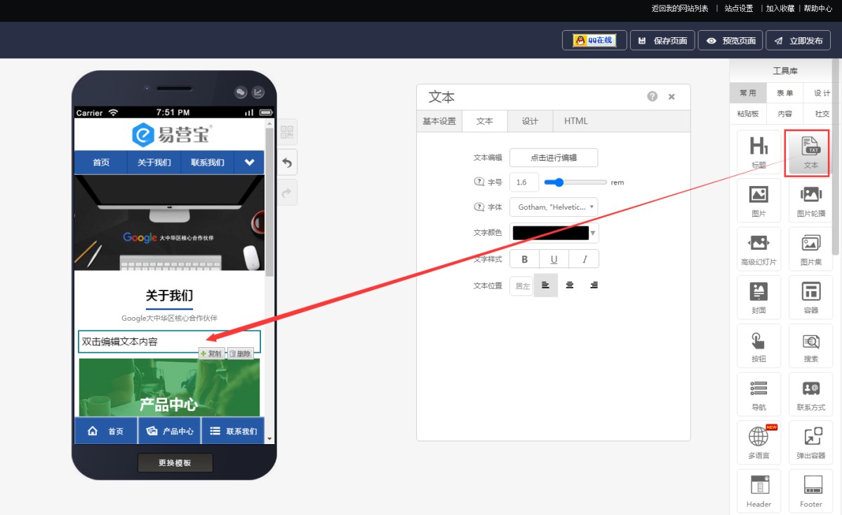1,在工具库中找到“文本”控件,并拖入编辑页的指定位置。