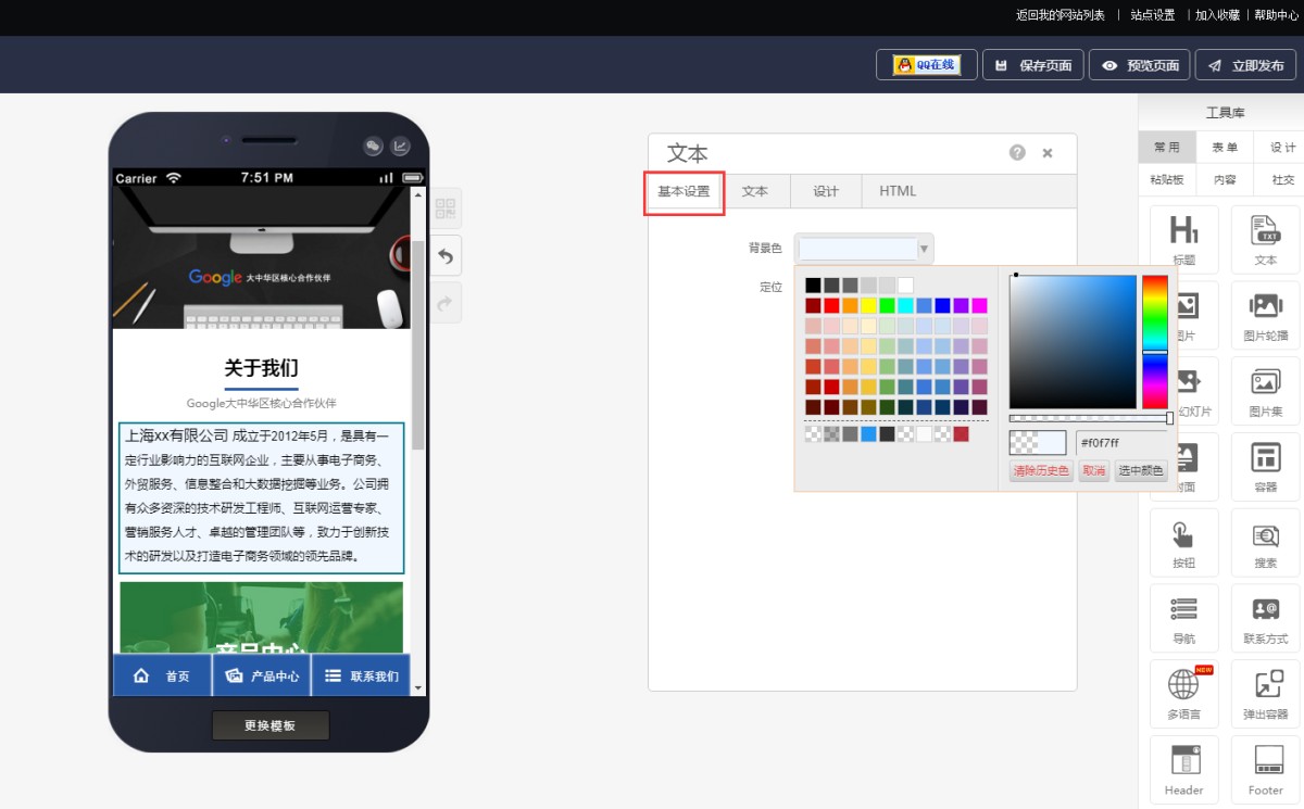 4,在文本属性-基本设置里,可以设置文本控件的背景色和定位(即上下左右间距)。