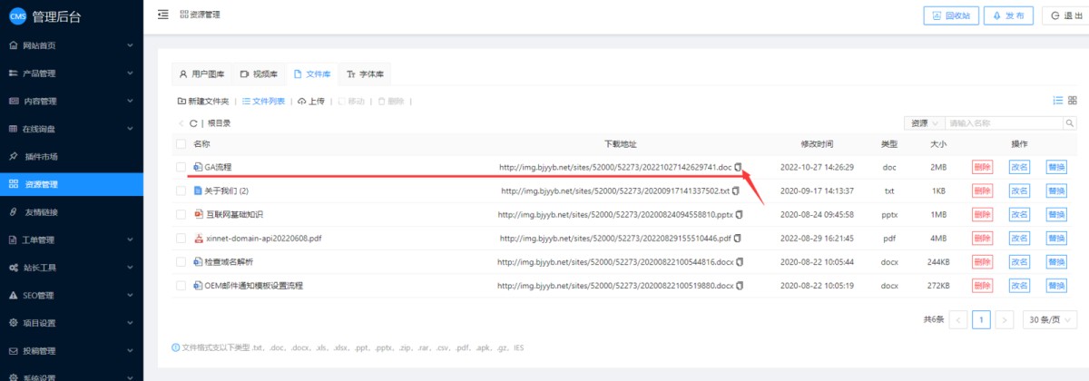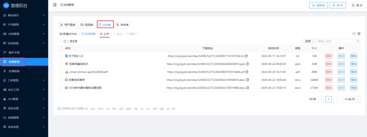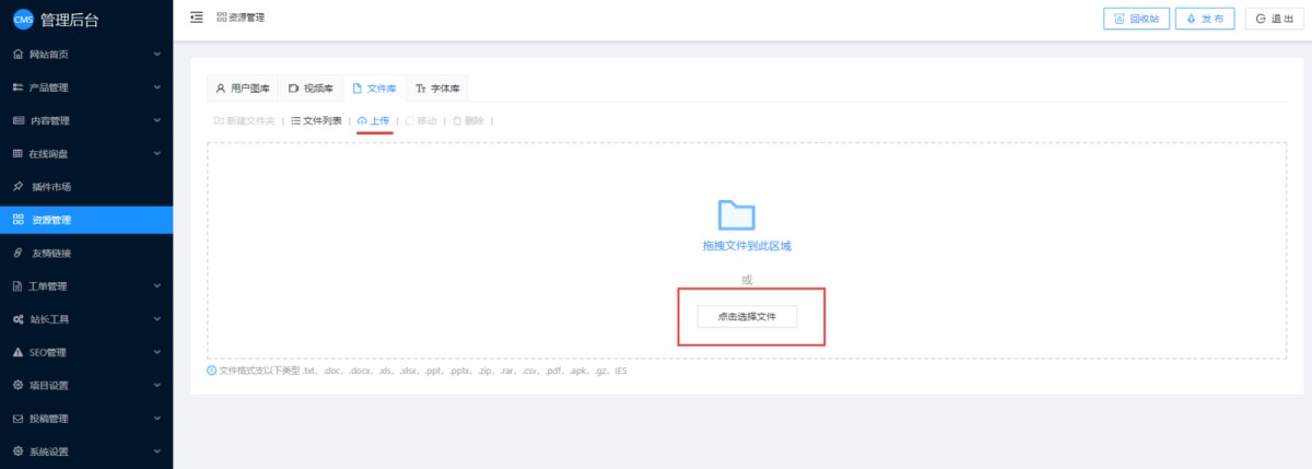 1,在CMS管理后台,点击资源管理-文件库。点击上传按钮。