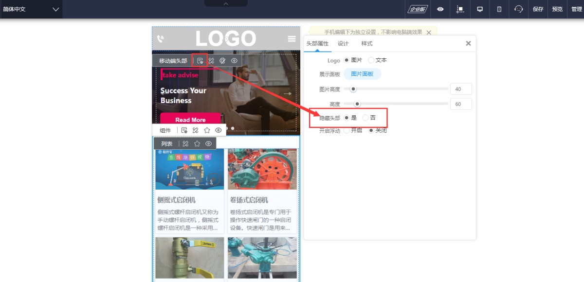 2,如果移动端头部区域是灰色的,说明开启隐藏了。点击头部属性,把隐藏关闭即可。