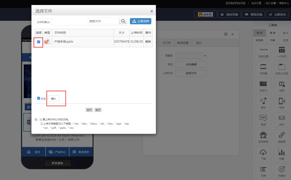 4,上传后的文档会显示在文件列表里,选择文件,点击确认。