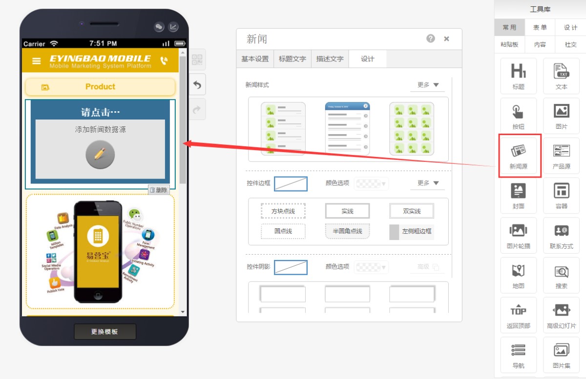 第二步:在编辑页面工具库里拖拽一个新闻源控件到需要的页面中,如下图: