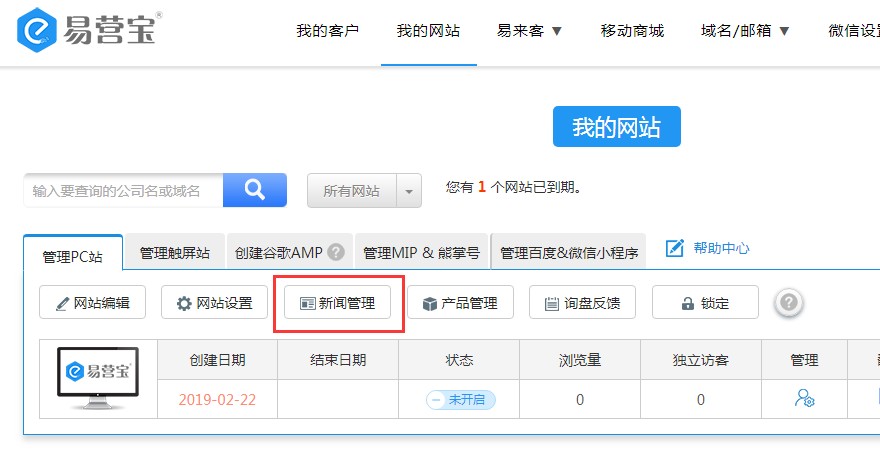 在我的网站列表页,选择要上传新闻的网站,点击新闻管理,如下图: