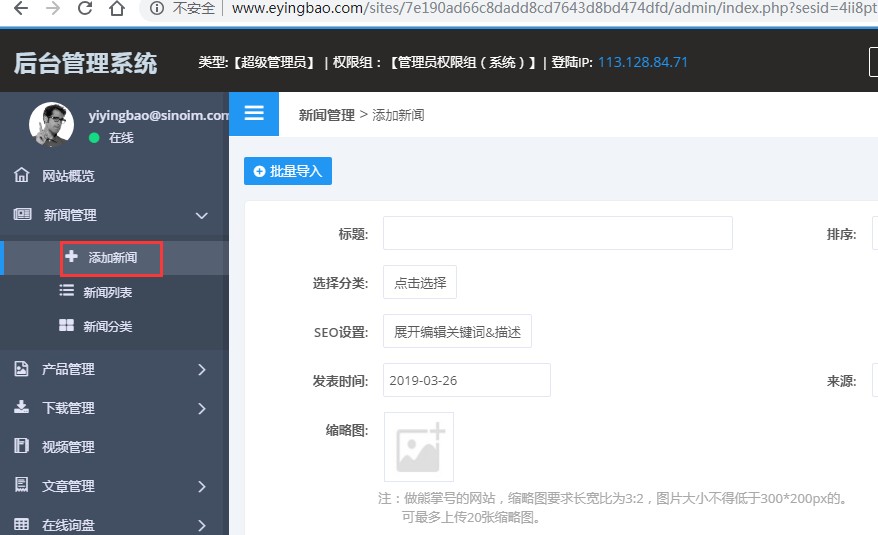 进入新闻管理页面后,点击新闻添加即可,新闻添加的方式有2种:①,批量上传:可在后台下载模板,按照模板的样式添加新闻内容,然后上传即可。②,手动添加:在新闻添加页面按照页面上的提示,添加相应的新闻信息即可。具体操作步骤可参考视频http://www.iqiyi.com/w_19rydjbt1h.html