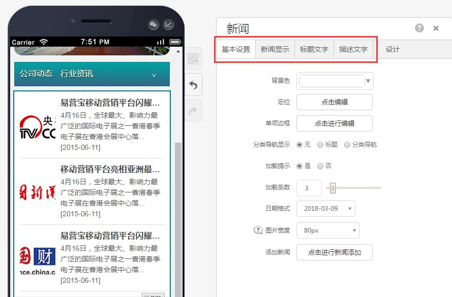 第三步:编辑新闻源控件属性面板的基本设置,标题,描述文字,如下图: