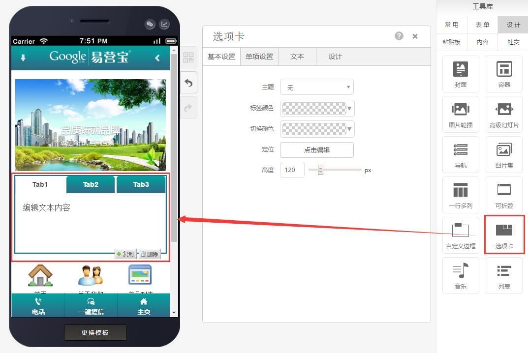 第二步:可根据自己的需求将标题、文本、按钮、图片、新闻源和产品源等拖入选项卡控件内,如下图: