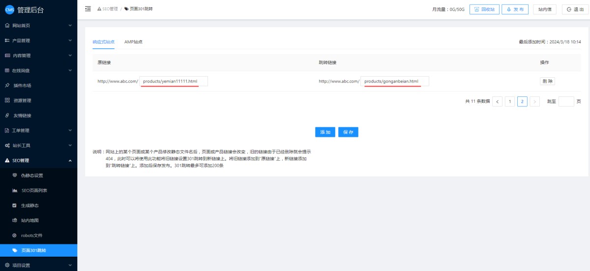 1,在CMS管理后台-SEO管理-页面301跳转里,点击添加按钮。