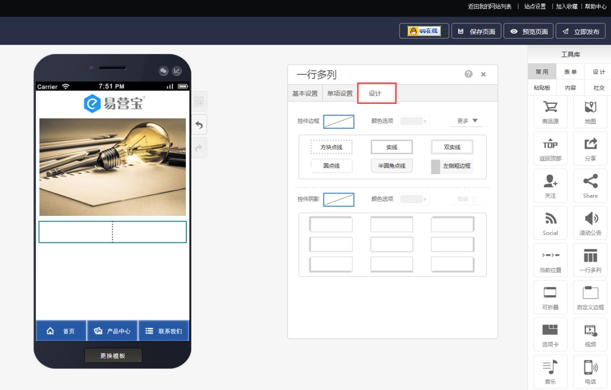 3,在设计里,可以为一行多列设置边框阴影等。