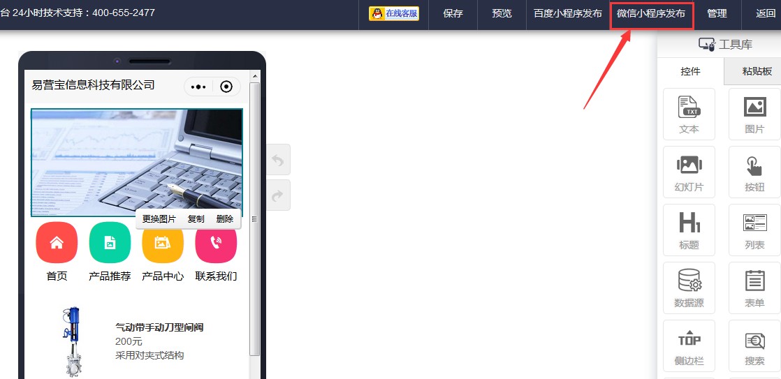 1, 在小程序的编辑页面,点击右上角的“发布微信小程序”。