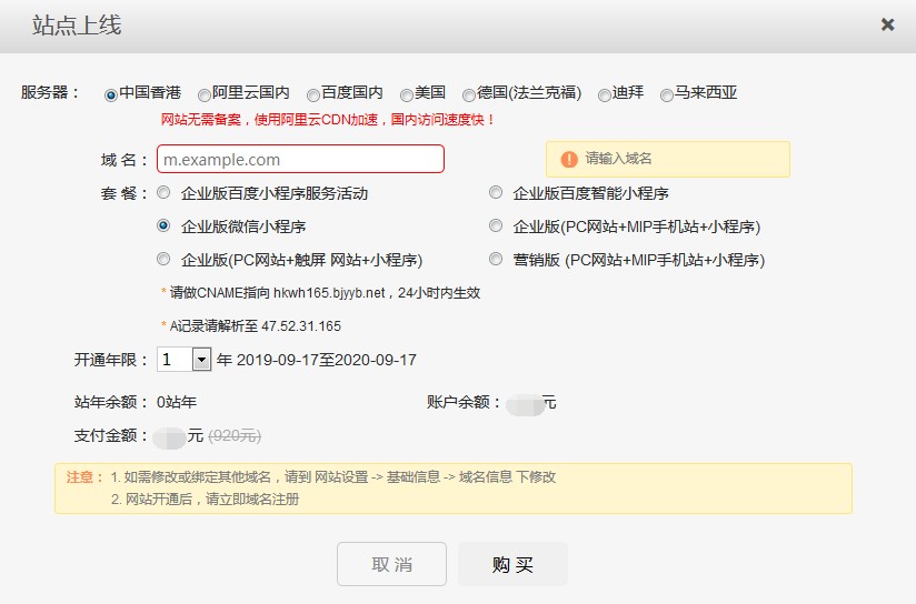 2, 选择服务器,绑定域名,选择套餐,付费开启。(注:如已支付百度小程序费用,则微信小程序开启时无需再付费,只需绑定域名即可。)