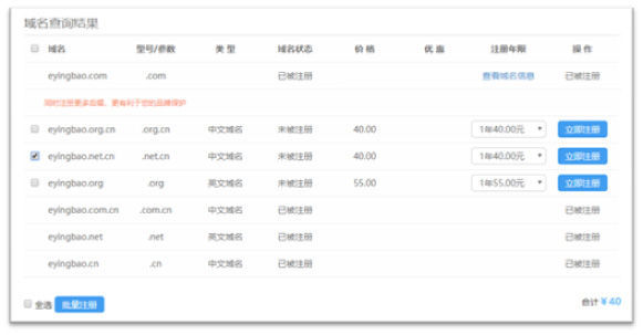 3.对于查询结果为 未注册 的域名,选择域名的 购买年限 后,单击 立即注册或批题注册