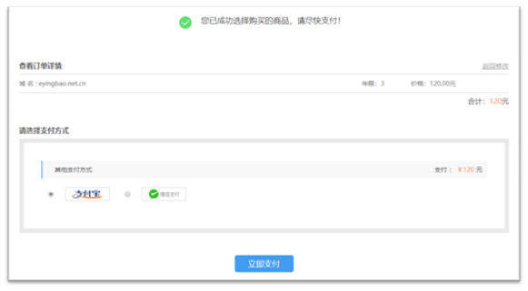 注意:域名属于即时产品,无法预订。只有最终付款成功才算注册成功,下单后请尽快结算。付款方式有多种,推荐通过余额支付。其他付款方式,支付宝或微信支付
