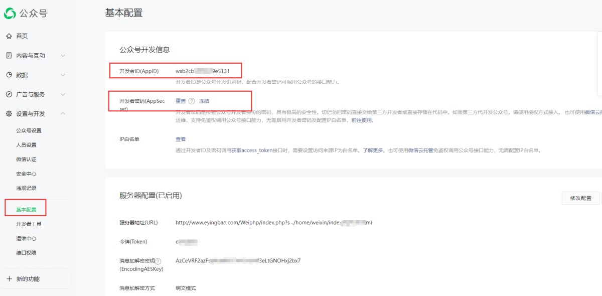 2,APP ID、秘钥在微信公众号的左侧菜单-设置与开发-基本配置里获取,将获取到的ID和密钥添加到网站管理后台(第一步的截图里)。