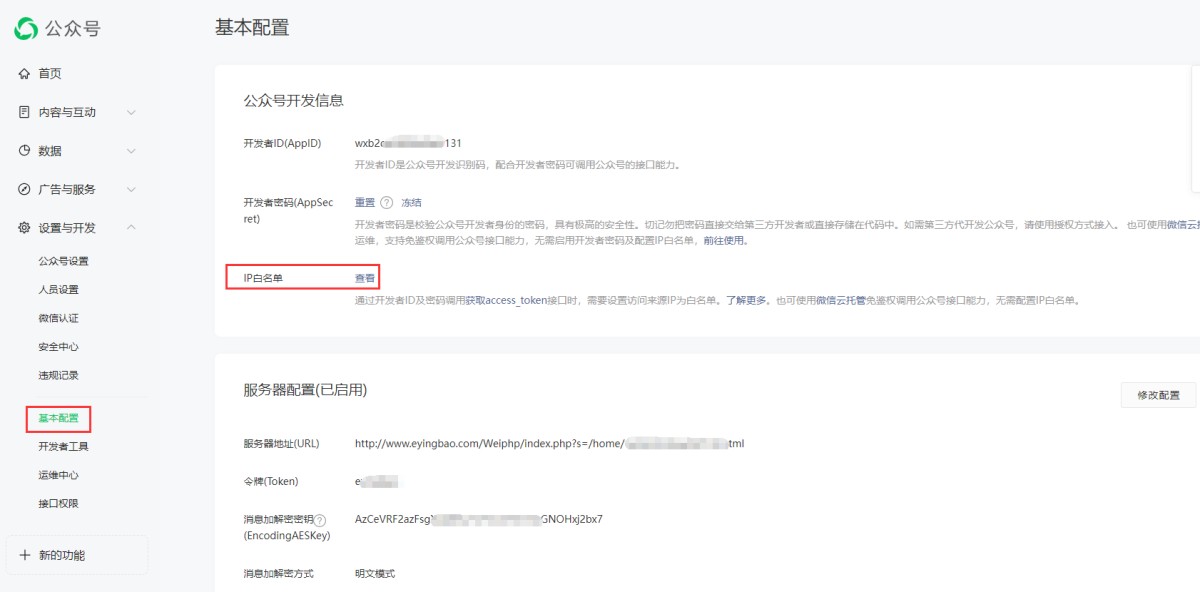 3,IP白名单设置在公众号的左侧菜单-设置与开发-基本配置里,将47.104.132.252,47.105.201.34,47.105.252.0添加到IP白名单里即可。