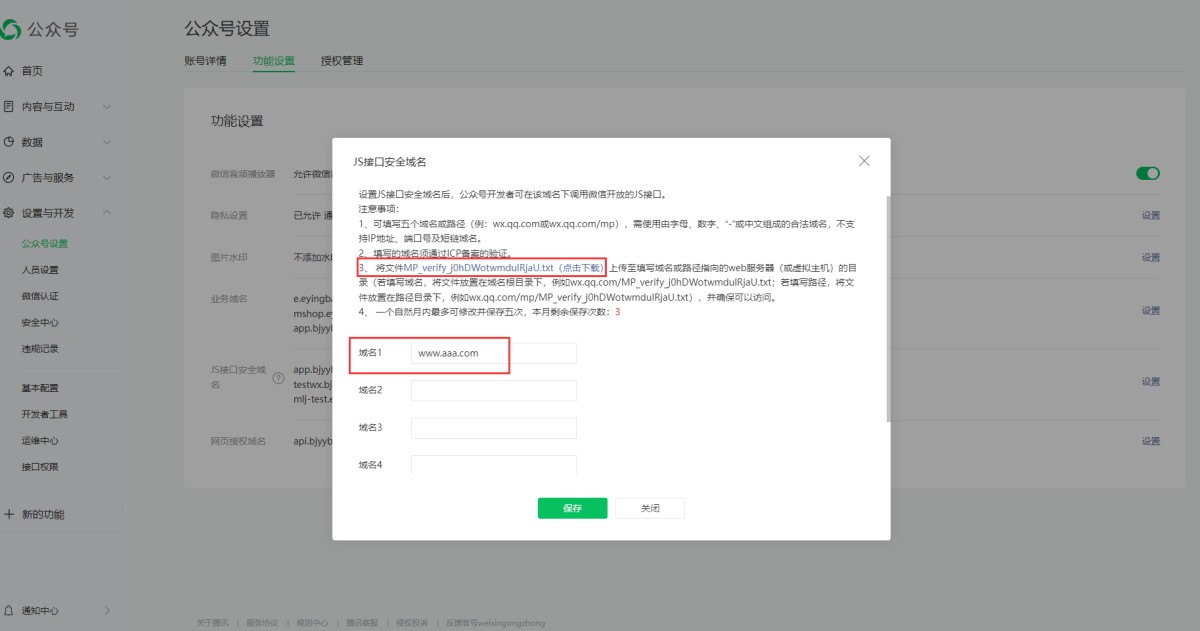 6,将下载的文件,上传到网站后台微信公众号配置里的验证文件这里,点击保存,无需发布。保存后,去微信后台安全域名窗口点击保存(第五步的截图位置)。