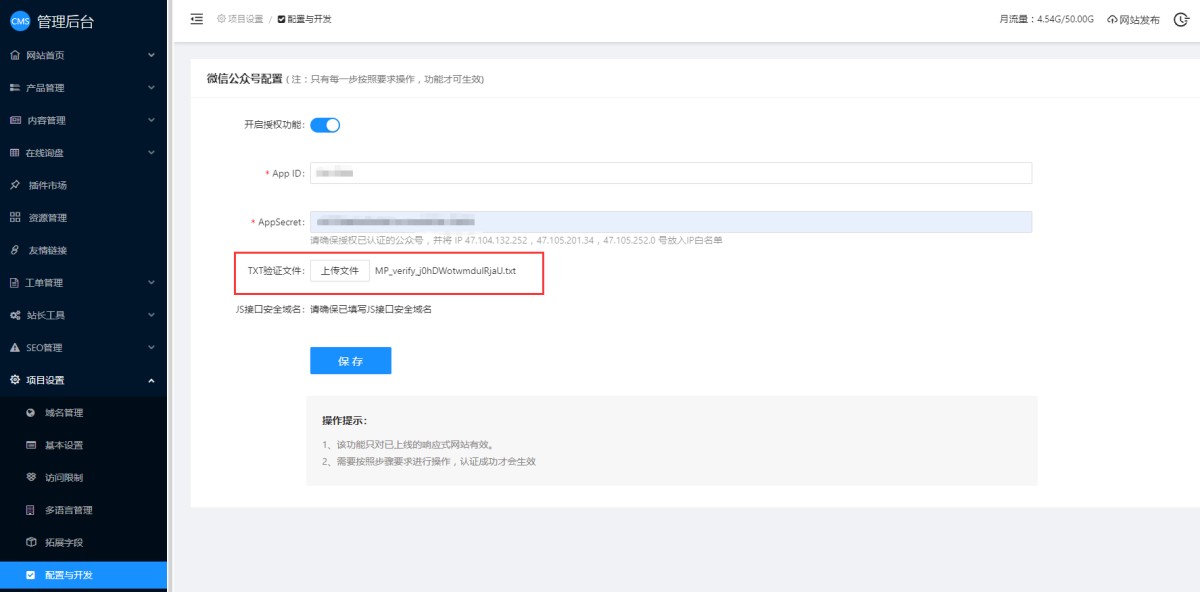 1,在CMS管理后台-配置与开发里,开启微信公众号的授权功能。依次配置APP ID,AppSecret(开发者密码),IP白名单,上传验证文件,设置安全域名。这五个步骤缺一不可。