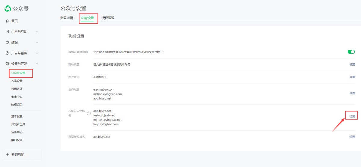 4,安全域名设置:在左侧菜单设置与开发里,点击公众号设置-功能设置-JS接口安全域名设置。
